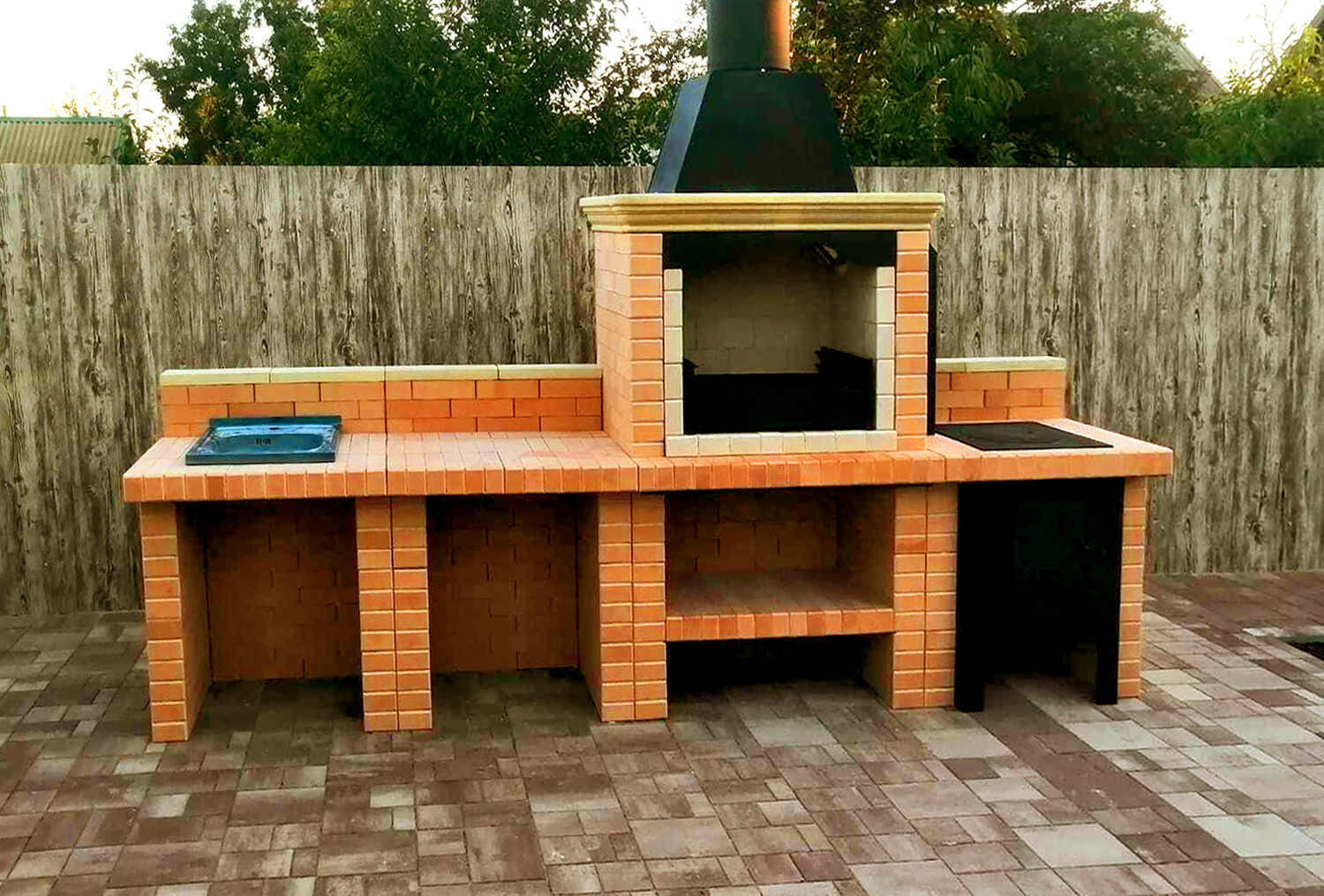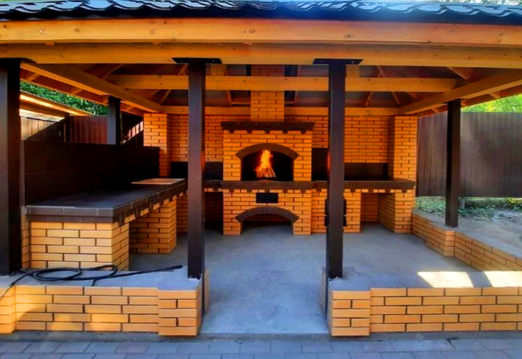 🪵 Отделка столешниц и фартуковОблицовка рабочих поверхностей гранитом или керамогранитными слэбами не только упрощает уборку, но и придаёт комплексу респектабельный вид. Внутренние полки под посуду и дрова выполняют из влагостойкой берёзовой фанеры либо кедровой доски, пропитанной термомаслом. Все деревянные элементы проходят браширование и покрытие атмосферостойким лаком.