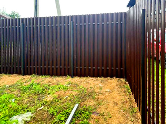 ! ПОСМОТРЕТЬ ВСЕ ЦЕНЫ НА РАБОТЫ ! Виды заборов для загородного домаЗабор из профнастилаСамый популярный материал для сплошных ограждений в деревне Осташево и селе Спас. Профнастил (оцинкованный стальной лист с полимерным покрытием) устанавливается на металлические столбы с лагами. Плюсы: долговечность (до 50 лет), простота ухода, защита от ветра и пыли, большой выбор цветов. Недостатки: парусность (требует прочных столбов и бетонирования), при ударе может деформироваться. Толщина металла — от 0,4 до 0,7 мм, высота листа — 1,5–2,5 м. Для домов в деревне Кашино и селе Ивановское мы рекомендуем профнастил с покрытием пурал или матовый полиэстер — они устойчивы к царапинам и выгоранию.Забор из сетки-рабицыЭкономичный вариант для разграничения соседних участков или ограждения больших территорий. Сетка натягивается между металлическими столбами на проволоку или крепится к рамкам. Плюсы: минимальная цена, не задерживает тень, пропускает воздух. Минусы: не защищает от ветра и посторонних взглядов, сетка может провисать, нужны антикоррозийные покрытия. В деревне Мусино и Суворово часто используют оцинкованную рабицу с ячейкой 50×50 мм. Для долговечности мы рекомендует сетку с полимерным покрытием (зелёную или чёрную).Забор из штакетника (евроштакетник и деревянный)Евроштакетник — это металлические планки (25–30 мм шириной), покрытые полимером. Набираются с зазором или сплошным рядом. Плюсы: лёгкий, не парусит, долговечный (50+ лет), внешне похож на дерево. Деревянный штакетник дешевле, но требует регулярной покраски и через 7–10 лет гниёт. В деревне Ченцы и Ботово заказы на евроштакетник растут с каждым годом — он не выцветает, не требует ухода, его легко ремонтировать.Секционный забор (сварные панели)Готовые секции из сварной сетки (сетка сварная) с полимерным покрытием. Крепятся между столбами. Обеспечивает хороший обзор, но при этом прочнее рабицы. Часто используется для ограждения спортивных площадок, детских садов, а также частных домов в современном стиле. Для Волоколамского района подходит при условии антикоррозийной защиты.Кирпичный и бетонный заборКапитальные ограждения для домов премиум-класса. Кирпичные столбы с пролётами из профнастила или кованых решёток. Бетонные панели — очень тяжёлые, требуют мощного ленточного фундамента. В деревне Шестаково и селе Ярополец такие заборы ставят редко из-за высокой цены и трудоёмкости. Мы выполняем их только по индивидуальным проектам.Технология строительства забора: этапы работРазметка и расчётПервым делом определяем границы участка (по кадастровому плану или замерам), отбиваем линию с помощью колышков и шнура. Рассчитываем количество столбов (шаг 2–3 м) и профнастила (ширина рабочая 1150–1200 мм). Высоту забора согласовываем с соседями (не более 1,8–2 м со стороны улицы, между участками — не выше 1,5–1,8 м). В деревне Осташево и селе Спас мы учитываем рельеф — на перепадах делаем ступенчатый забор или используем столбы разной длины.Установка столбов и фундаментаДля забора из профнастила и евроштакетника столбы (профильная труба 60×60 мм, 80×80 мм) бетонируются в скважины глубиной 1,0–1,2 м (ниже промерзания). Шаг — 2–2,5 м. Для слабых и глинистых грунтов (типичных для Волоколамского района) мы рекомендуем забутовку щебнем с трамбовкой или полное бетонирование с армированием. Столбы выставляются ст